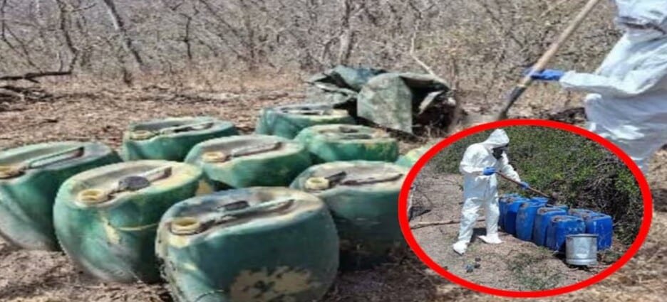 En los laboratorios, las autoridades encontraron diversas sustancias químicas, así como equipo especializado, incluyendo bombas de agua, reactores, bidones, tambos, costales, condensadores, tanques de gas y destiladores.