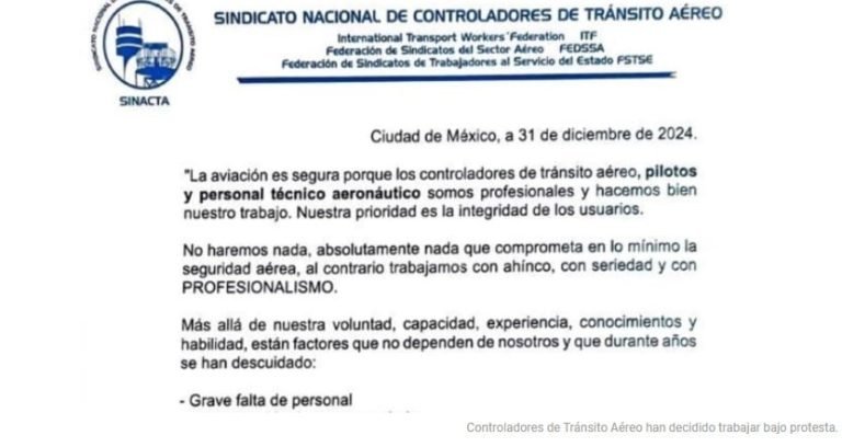 El Sindicato Nacional de Controladores de Tránsito Aéreo (SINACTA) informó que sus integrantes han decidido trabajar bajo protesta debido a diversas problemas que afectan sus condiciones laborales. En un comunicado difundido este 31 de diciembre, los controladores destacaron que su…